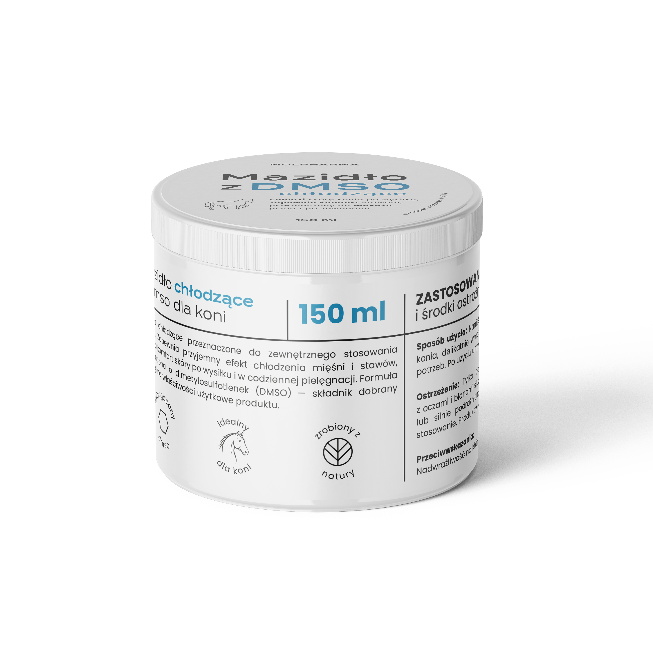 - Formuła z DMSO została dobrana z uwagi na właściwości użytkowe produktu w pielęgnacji skóry koni.