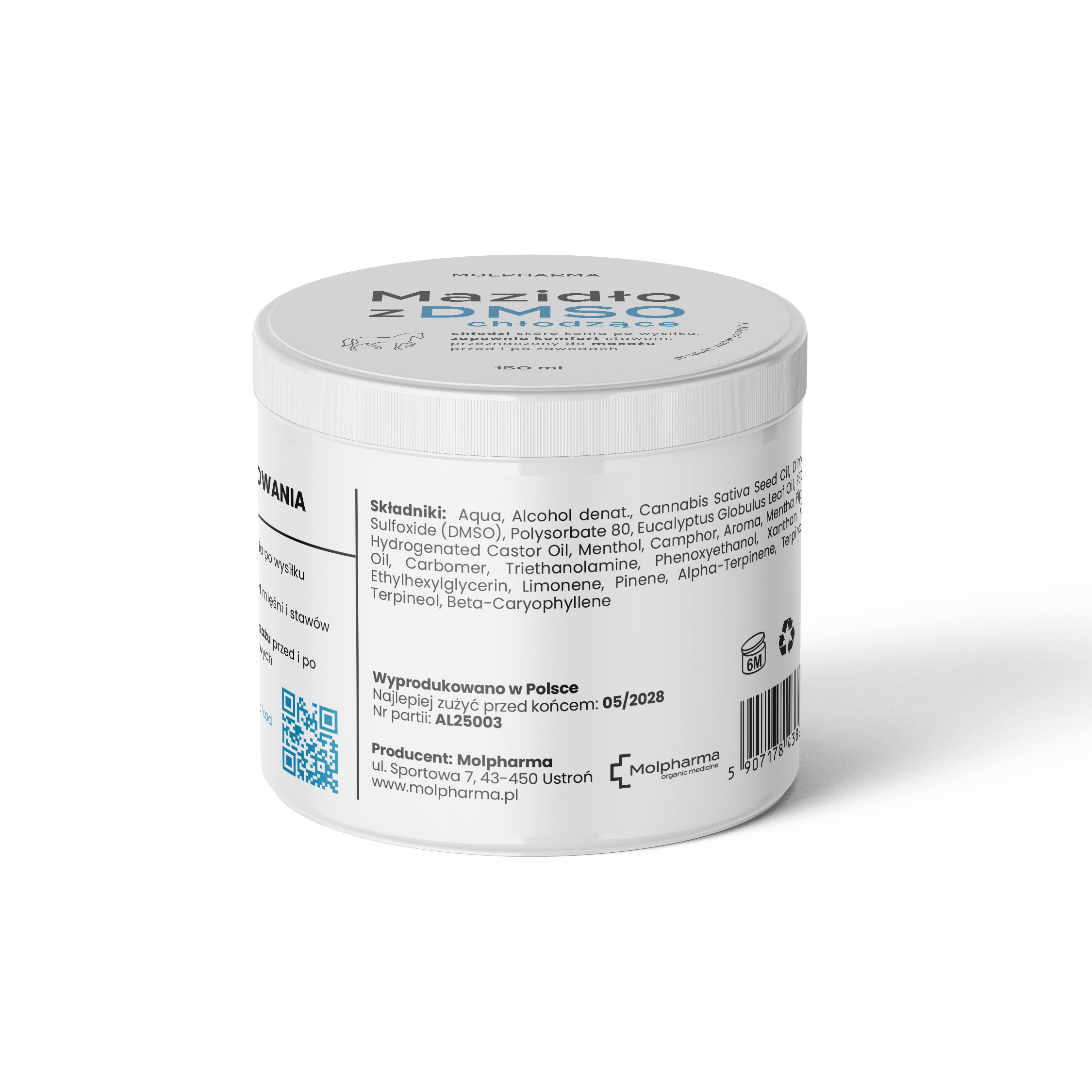 Mazidło chłodzące z DMSO dla koni 150 ml to specjalistyczny preparat przeznaczony do zewnętrznej pielęgnacji skóry koni, opracowany z myślą o wsparciu komfortu mięśni i stawów po wysiłku. Innowacyjna formuła łączy działanie składników chłodzących z dodatkiem dimetylosulfotlenku (DMSO), cenionego za swoje właściwości użytkowe w preparatach pielęgnacyjnych. Produkt przynosi natychmiastowe uczucie chłodzenia, pomagając zredukować dyskomfort po treningu, zawodach sportowych lub intensywnej aktywności. Regularne stosowanie wspiera codzienną pielęgnację skóry konia oraz poprawia jego ogólny komfort ruchowy. Mazidło doskonale sprawdza się zarówno przed, jak i po wysiłku.